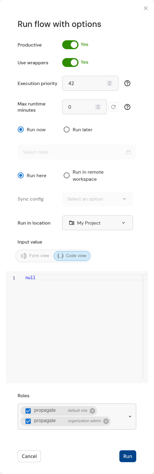 You can manually create executions of flows using the user interface. Navigate to the flow you want to start and click on "Run" or "Run in dev mode" to start the execution in productive or development mode respectively: